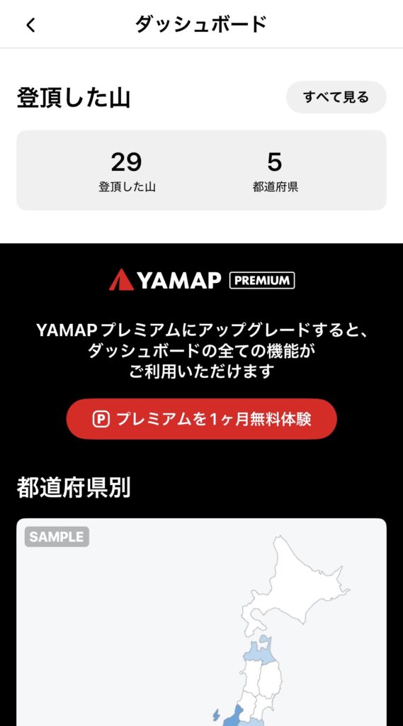 「ダッシュボード」に自分がこれまで登った山の一覧、訪れた都道府県、活動データがきれいに整理されていて、眺めているだけで「また山に行きたい!」という気持ちになるんですよね。