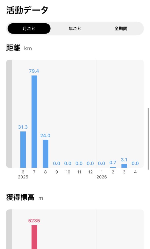 僕のデータを見ると、2025年7月が最も活発で月間79.4km・獲得標高5,235m。この数字を見るだけで「あの夏、よく登ったな…!」と振り返れます。
