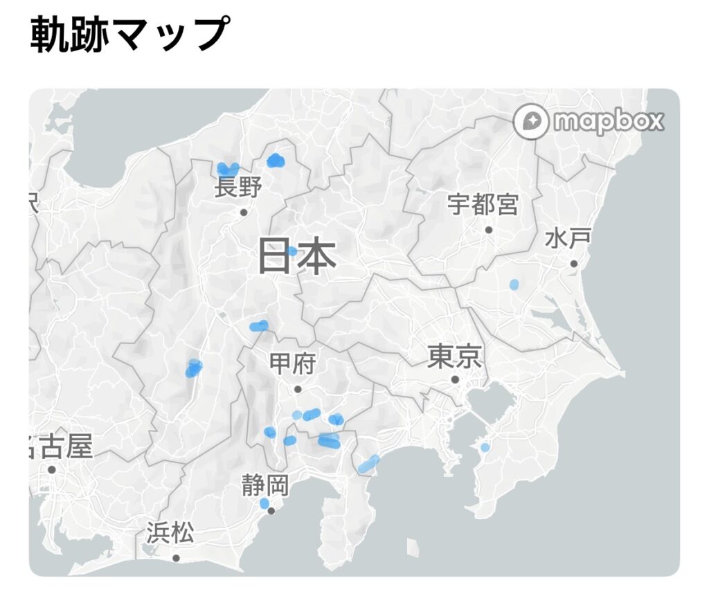 ヤマップの軌跡マップは青いドットでエリアが示されるシンプルなデザインで、「どのあたりの山を登ったか」の全体感は掴めますが、ルートの詳細な振り返りはヤマレコに軍配が上がります。