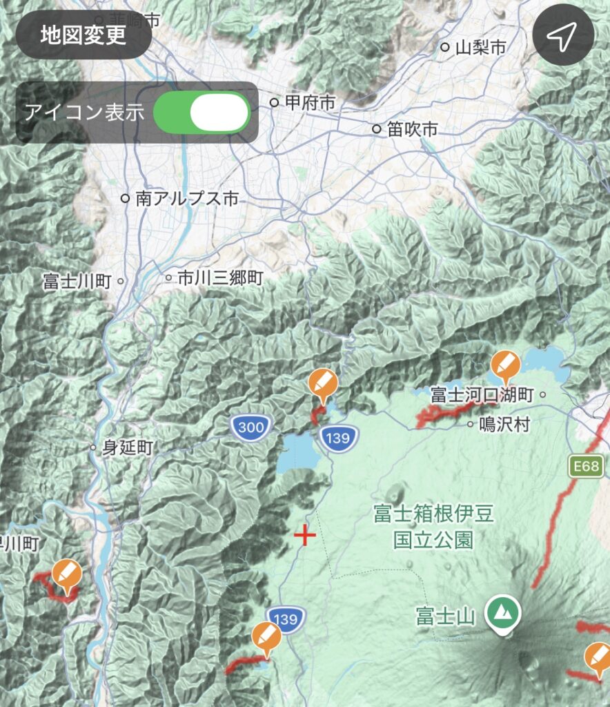 見比べるとわかりますが、ヤマレコの軌跡マップは地形図ベースで赤いルートラインがくっきり表示され、実際に歩いたコースが一目瞭然。さらに、軌跡のアイコンをタップするとその日の登山記録にすぐアクセスできるのも便利です。