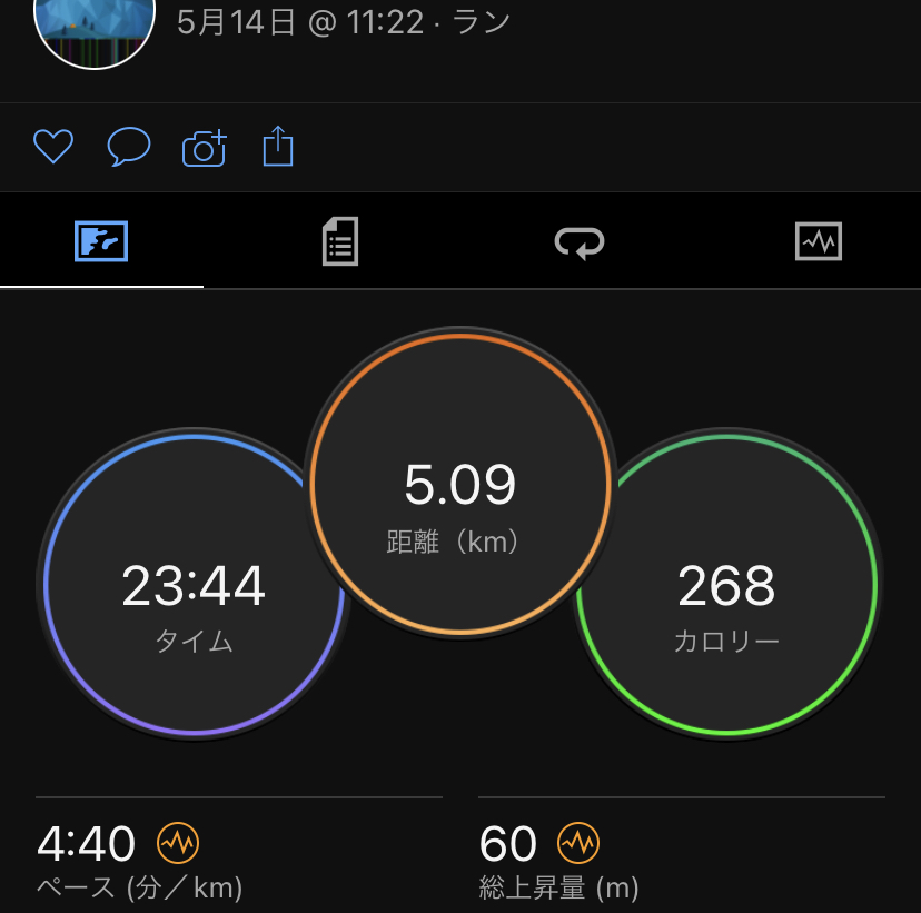 普段のジョギングもキロ4ぐらいで楽々と走ってみたいですが、今はこのペースもキツい笑