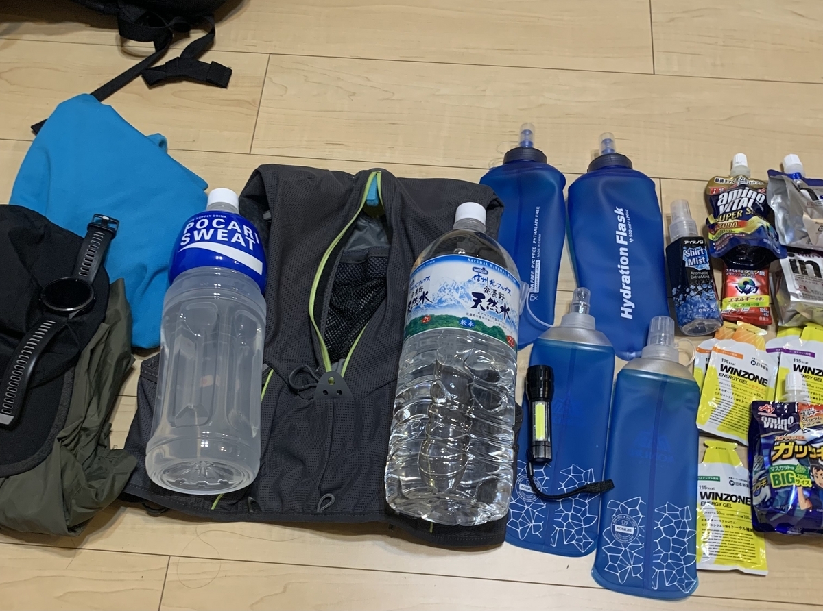 前のトレランレースで水分とエネルギー不足で撃沈したので、今回は水分とエネルギー多めの準備しました!